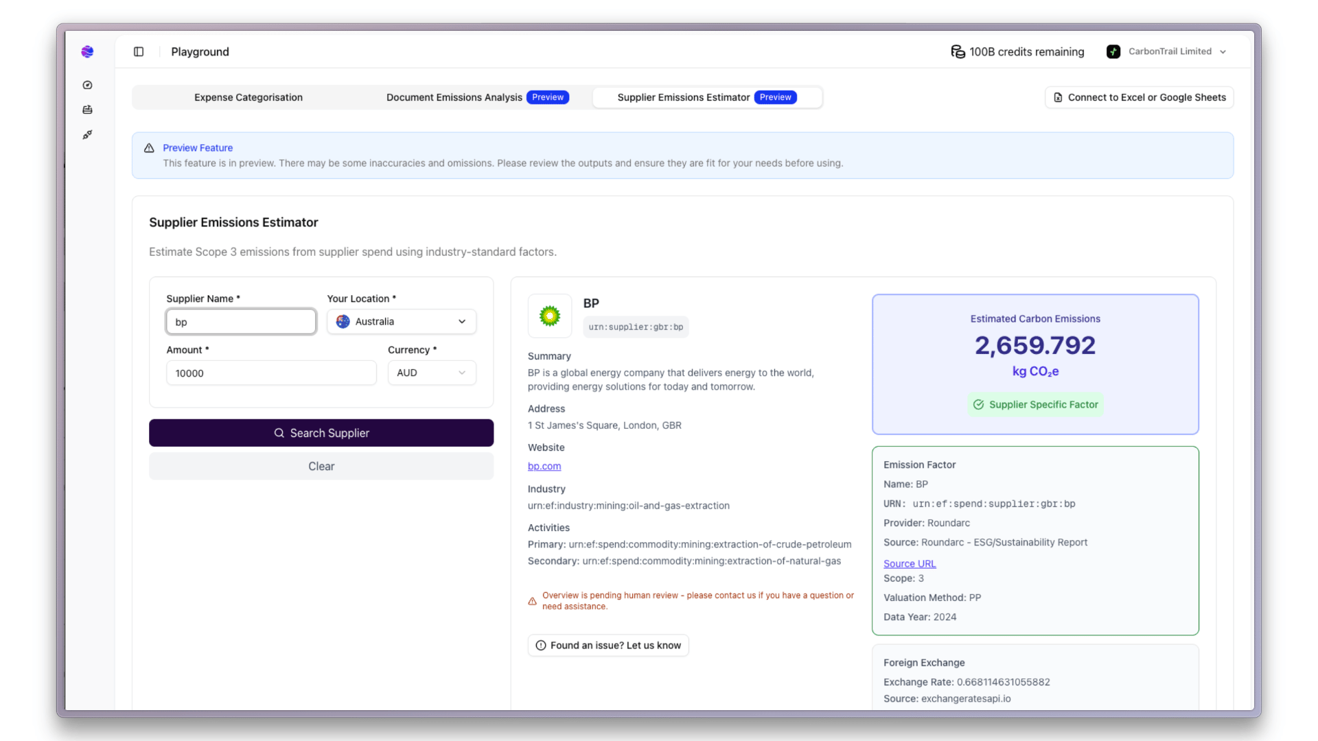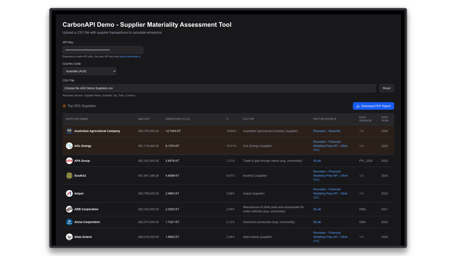 Submit supplier data individually or in bulk via API or CSV upload. The system automatically identifies each supplier and determines the most appropriate emission factor for efficient Scope 3 materiality assessments.